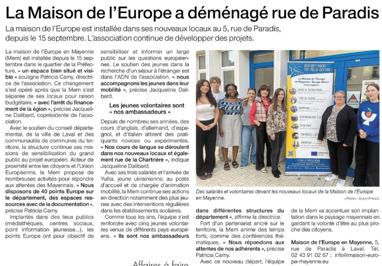 - Article paru dans le Ouest France – Vendredi 19 septembre 2025 : https://www.ouest-france.fr/pays-de-la-loire/laval-53000/la-maison-de-leurope-a-demenage-a-laval-depuis-le-15-septembre-2025-12c87198-94bc-11f0-bee7-32a50fc521a5
